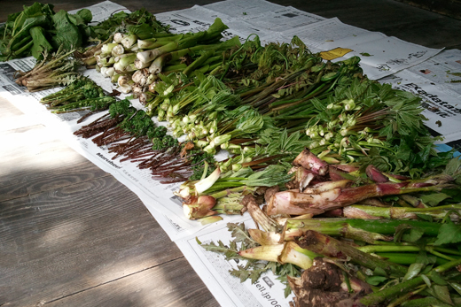 山桜の煙る頃、月山渓谷の斜面はいち早く雪がとけて陽が当たり、ゼンマイ、ヤマウド、オウバギボウシなど、たくさんの山菜が次々と顔を出してくる。谷底に残る厚い雪は川にとけだし、生まれたての風が渓谷を吹きあげる。滑り落ちそうな道なき道を、僕たちは山菜を求めて歩いていた。