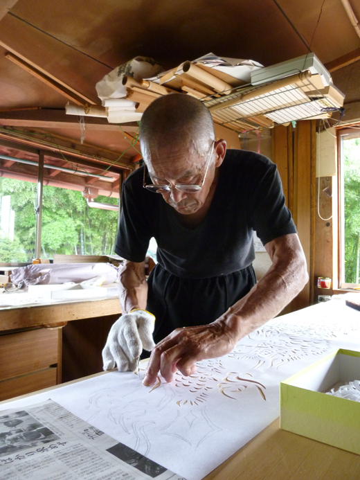 ラジオから甲子園中継が流れるお盆過ぎ、出羽三山の掛け軸を手がける羽黒町手向の表具師、滝水義道さんの仕事場では、秋の峰「二の宿」を彩る紙の「切り飾り」がつくられていた。