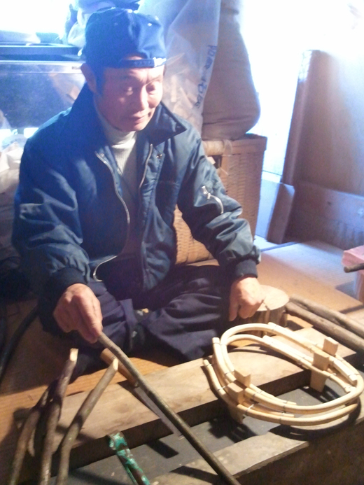 製作は春に始まる。イタヤカエデを採集し、秋まで水に浸して雪をかくツメに。秋には樹齢5年ほどの節のないオオバクロモジを調達し、祖父は囲炉裏で、康明さんは薪ストーブの灰汁で曲げて、輪の部分に加工する。輪にツメを組み合わせる角度と安定性に余人の及ばぬ技が宿る。代々の手先の起用さから、屋号は「からくり儀右ェ門」と呼ばれた。