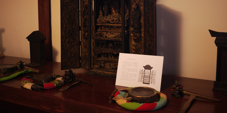この展示では、松代・太平の集落センターに保存されているかつての庵主堂の仏像や仏具をお借りして、期間限定の展示を設置しています。遠くから聞こえてくる川の流れや、窓から差し込む四季折々の光にこころを澄ましながら、妻有のこころのかたちに、どうぞ触れてみてください。